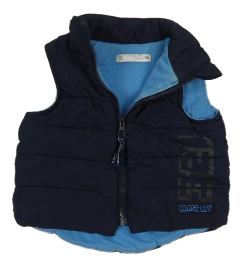 Tmavomodrá šušťáková zateplená vesta s nápisom