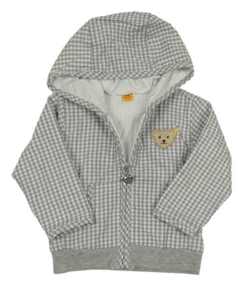 Sivo-biela kockovaná ľahká bunda s medvěďom a kapucňou