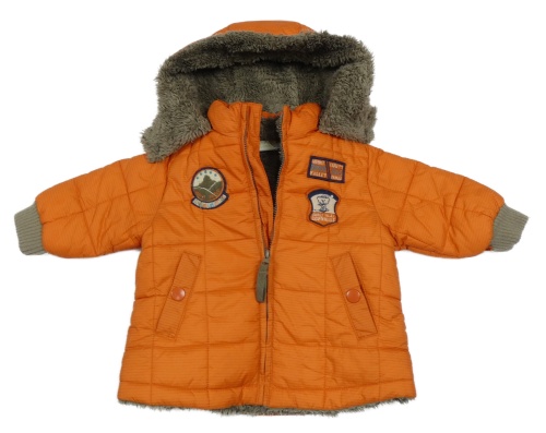Oranžová pruhovaná prešívaná šušťáková zateplená bunda s nášivkami a kapucňou