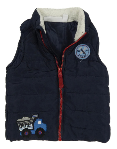 Tmavomodrá šušťáková zateplená vesta s nákladiakom