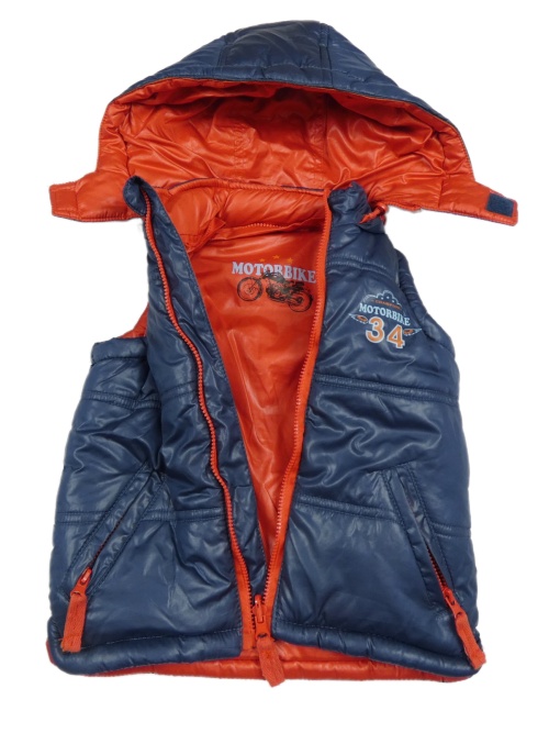 • Tmavomodrá prešívaná šušťáková zateplená obojstranná vesta s číslom a odopínacíá kapucňou ORCHESTRA