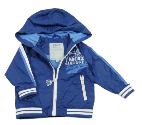 Modro-biela šušťáková jarná bunda s nápismi a kapucňou KANZ