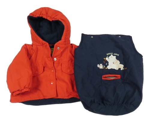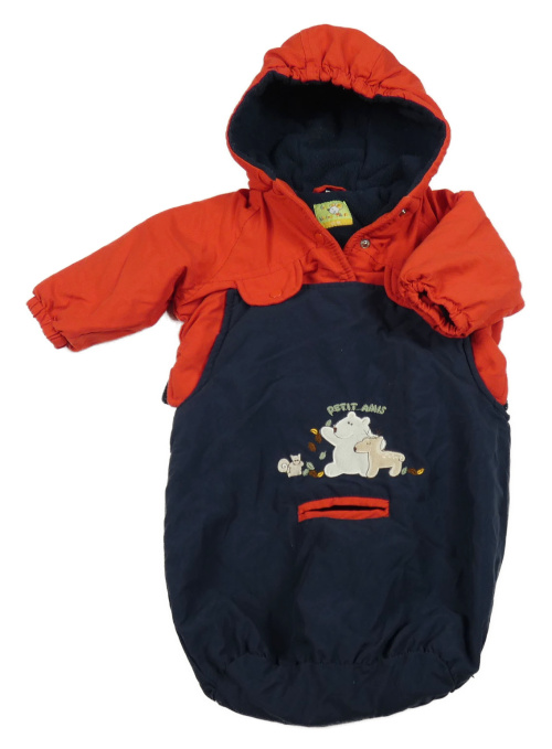 2v1- Červeno-tmavomodrá šusťáková zimní bunda/fusak so zvieratkami a kapucňou