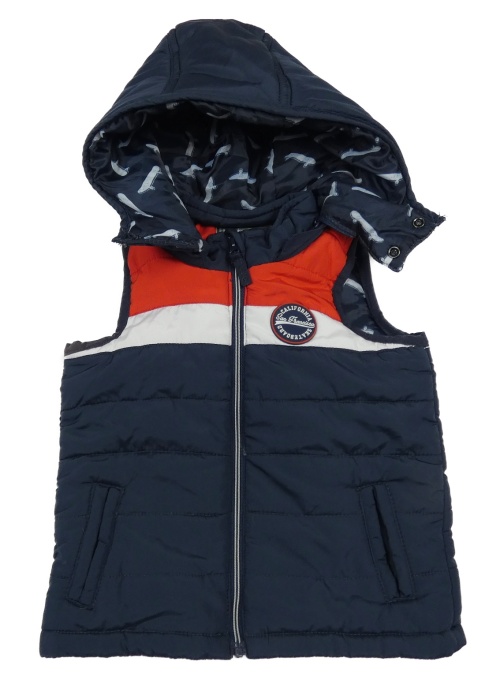 • Tmavomodro-bielo-červená prešívaná šušťáková zateplená vesta s nášivkou a odopínacíá kapucňou ORCHESTRA