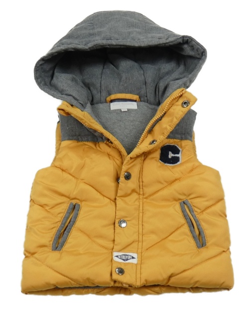 Okrovo sivá šušťáková zateplená vesta s písmenem a kapucňou