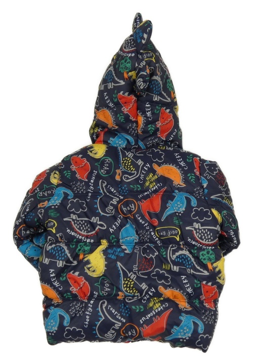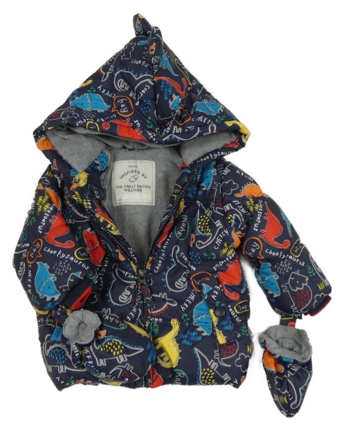 • Tmavomodro-farebná šušťáková zateplená bunda s dinosaurami a kapucí + rukavice George
