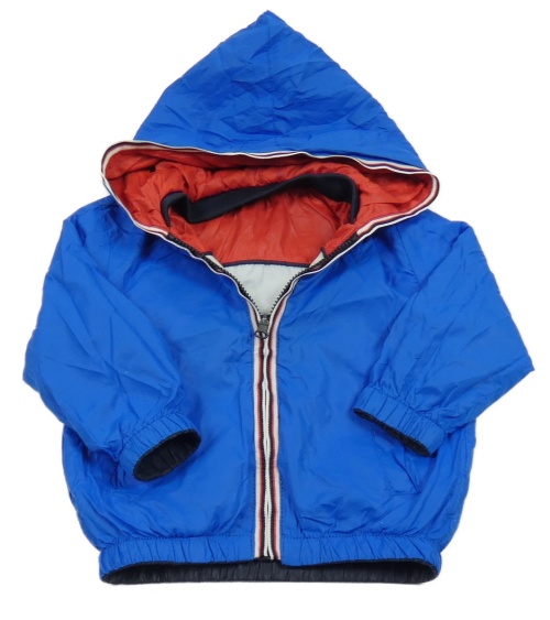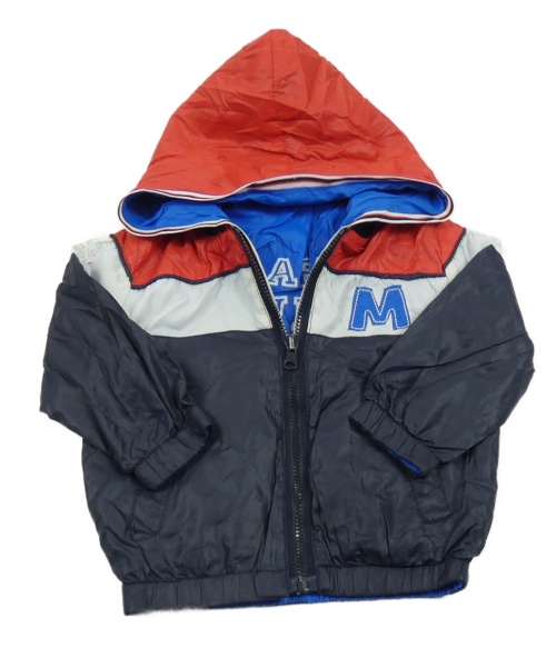 • Tmavomodro-bielo-červená šušťáková jarná obojstranná bunda s písmenkom a kapucňou LOSAN