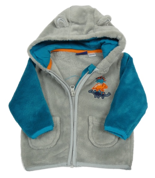 Sivo-modrozelená plyšová bunda s dinosaurami a kapucňou s uškami lupilu
