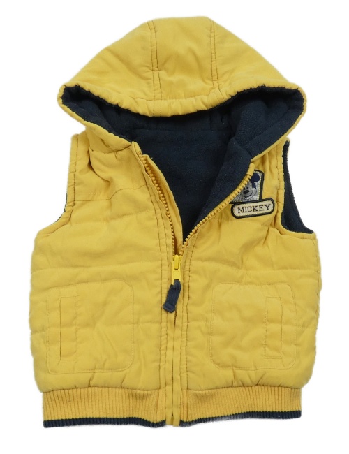 Žlto-tmavomodrá zateplená vesta s Mickey Mousem a kapucňou