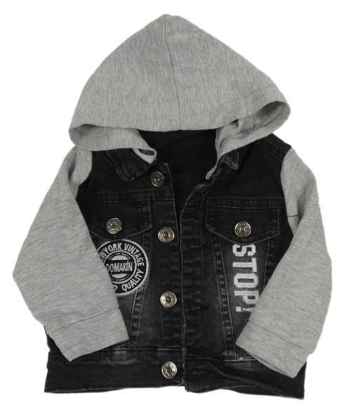 Čierno-sivá riflovo/tepláková bunda s nápismi a kapucňou