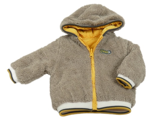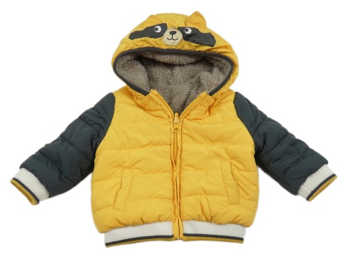 Žlto-sivá šušťáková zimná obojstranná bunda s kapucňou s medvěďom