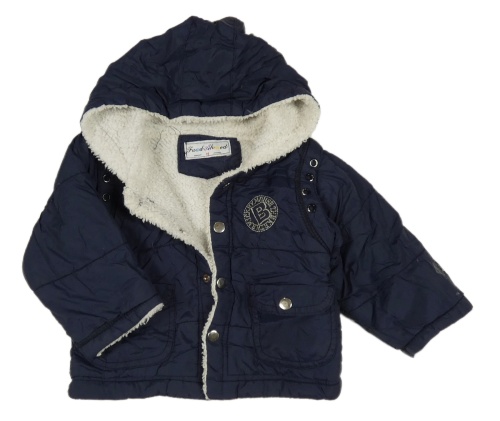 Tmavomodrá šušťáková zateplená bunda s písmenkom a Pú a kapucňou