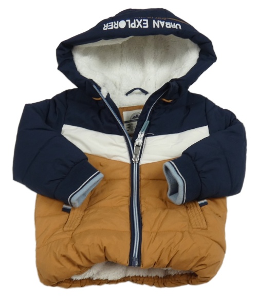 Tmavomodro-hnedo-biela šušťáková zimná bunda s kapucňou