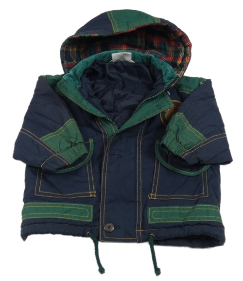 Tmavomodro-tmavozelená plátenná zateplená bunda s medvěďom a kapucňou