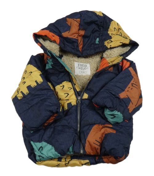 Tmavomodrá šušťáková zimná bunda s dinosaurami a kapucňou F&F