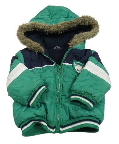 Zeleno-tmavomodro-biela šušťáková zateplená bunda s nášivkou a kapucňou
