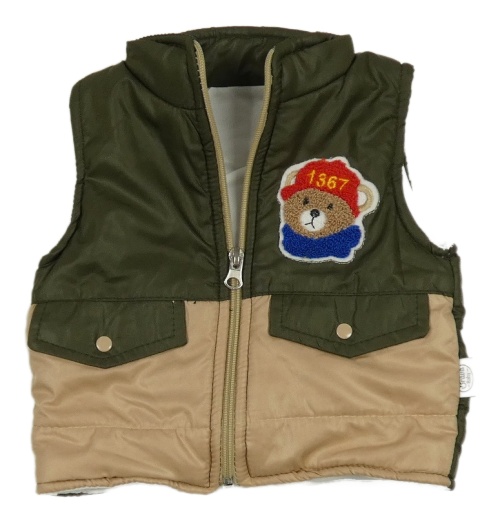 Kaki-béžová šušťáková zateplená vesta s medvěďom