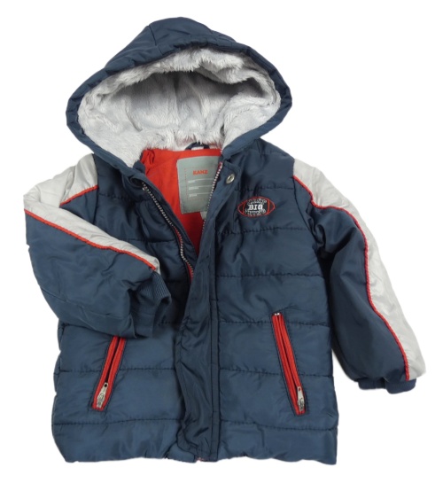 • Tmavomodro-svetlosivá prešívaná šušťáková zimná bunda s loptou a pruhmi a kapucňou KANZ