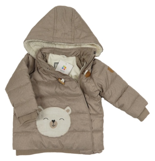 • Nové - Svetlohnedá melírovaná prešívaná šušťáková zimná bunda s medvěďom a kapucňou Topomini