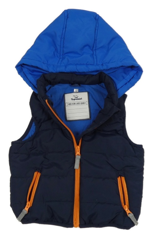 Tmavomodrá šušťáková zateplená vesta s modrou kapucňou Topomini
