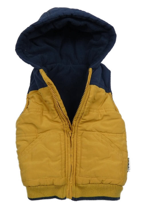 • Tmavožluto/tmavomodrá prešívaná šušťáková zateplená vesta s kapucňou St. Bernard