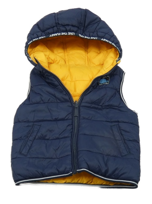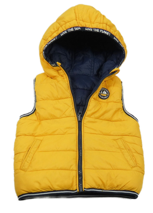 Tmavomodrá šušťáková prešívaná zateplená obojstranná vesta s kapucňou