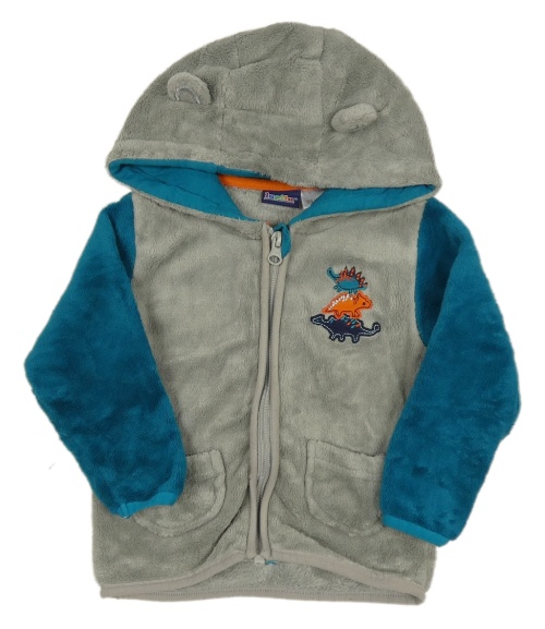 Sivo-petrolejová plyšová bunda s dinosaurami a kapucňou s uškami lupilu