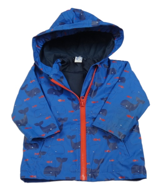 Modrá nepromokavá jesenná bunda s velrybami a kapucňou C&A