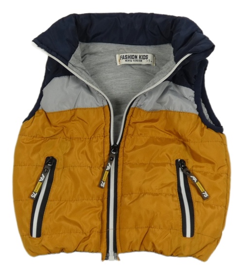 Okrovo-tmavomodro-sivá šušťáková prešívaná zateplená vesta