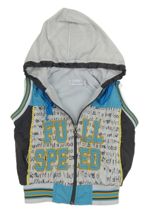Modro-sivá šušťáková podšitá vesta s nápismi a kapucňou