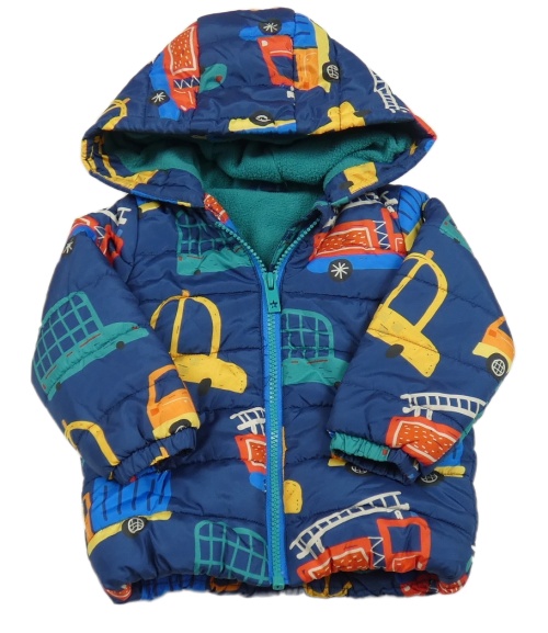 • Tmavomodrá prešívaná šušťáková zimná bunda s autami a autobusmi a hasiči a kapucňou St. Bernard