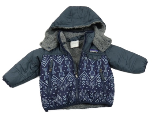 Tmavomodro-šedomodrá šušťáková vzorovaná zimná bunda s kapucňou Patagonia