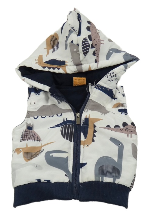Biela šušťáková zateplená vesta s dinosaurami a kapucňou