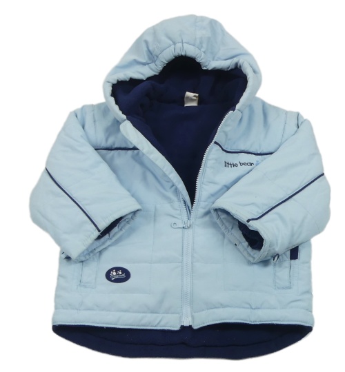 Svetlomodrá šušťáková zateplená bunda s nápisom a kapucňou