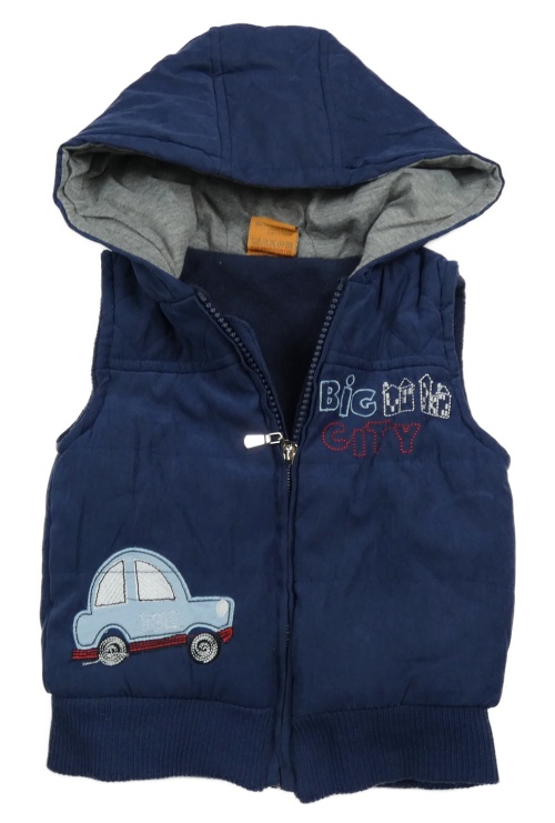 Tmavomodrá zateplená vesta s autom a kapucňou