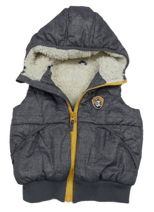 Sivá šušťáková zateplená vesta s nášivkou a kapucňou