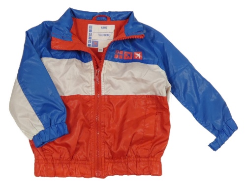 Modro-bielo-červená šušťáková jarná bunda s potlačou