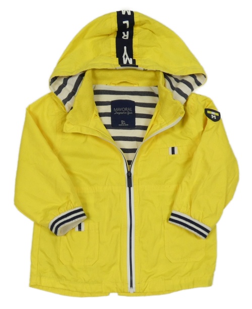 • Žltá šušťáková jarná parka s nášivkou a pruhmi a odopínacíá kapucňou Mayoral