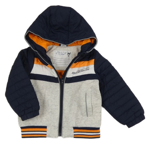 • Tmavomodro-sivo-oranžová teplákovo/šusťáková zateplená bunda s nápisom a kapucňou Dopodopo