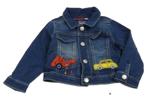 Tmavomodrá tepláková rifľová bunda s bágrom a autom a golierikom Bluezoo