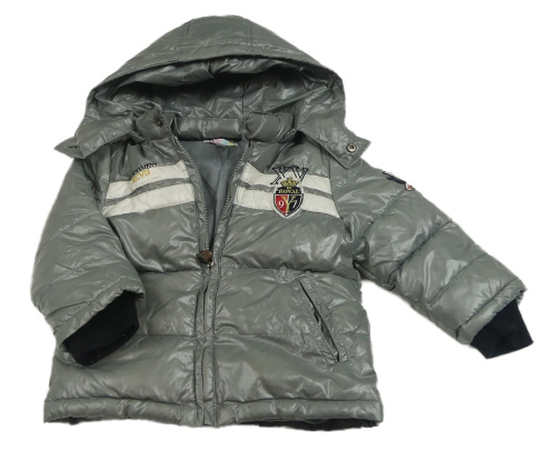Sivá pogumovaná zimná bunda s pruhy, nášivkou a kapucňou