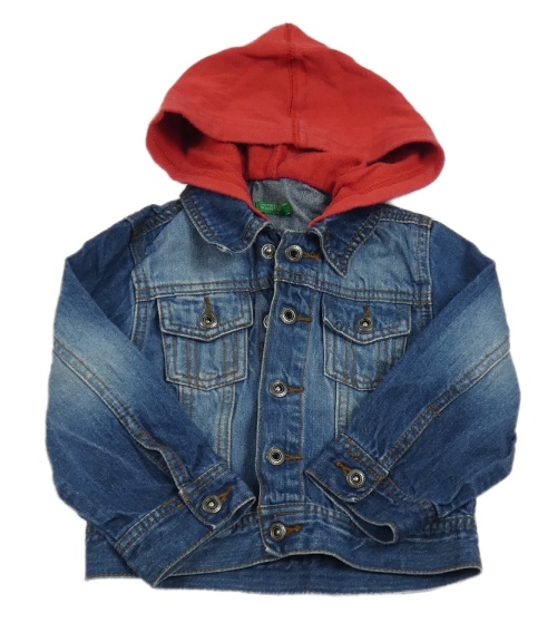 Tmavomodrá rifľová bunda s červenou teplákovou kapucňou Benetton