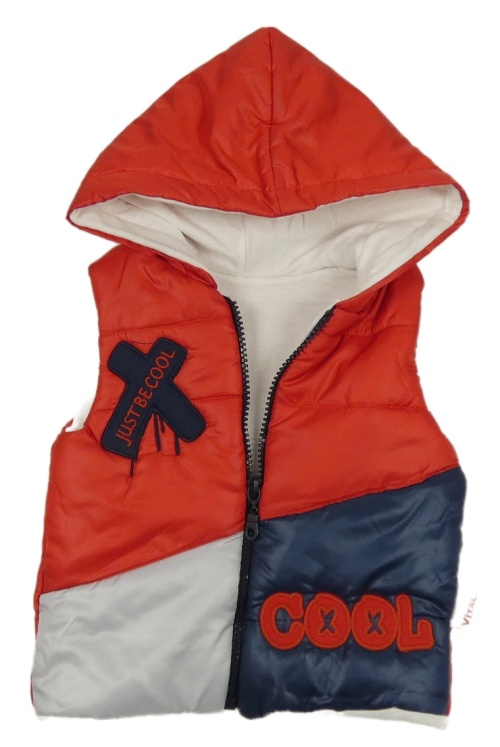 Červeno-tmavomodro-sivá šušťáková zateplená vesta s nápismi a kapucňou