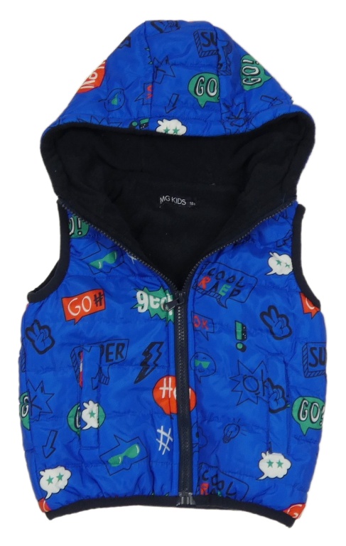 Tmavomodrá šušťáková zateplená vesta s obrázkami a kapucňou