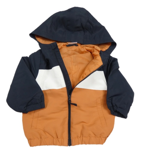Tmavomodro-tehlovo-biela šušťáková zateplená bunda s kapucňou