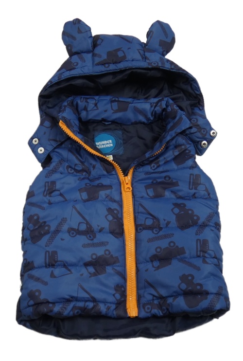 Tmavomodrá šušťáková zateplená vesta s autami a kapucňou