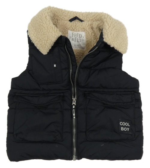 • Čierna prešívaná šušťáková zateplená vesta s nášivkou a huňatým golierikom F&F