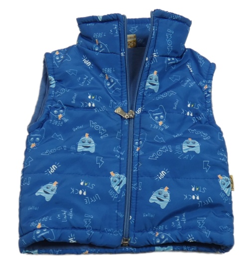 Modrá šušťáková zateplená vesta s nápismi a príšerkami