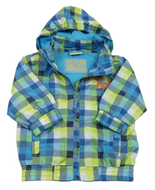 • Modro-bílo-limetkovo-tmavomodrý kostkovaný jarní bomber s číslom a ukrývací kapucňou Topolino