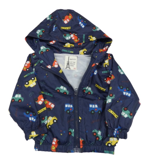 Tmavomodrá šušťáková jarná bunda s autíčky a kapucňou